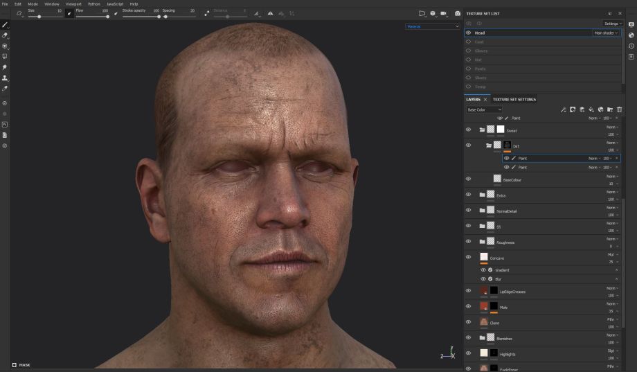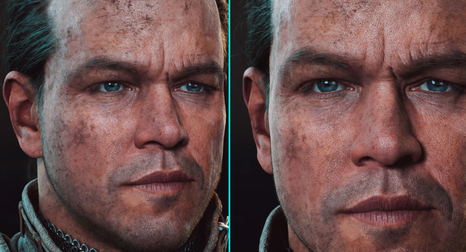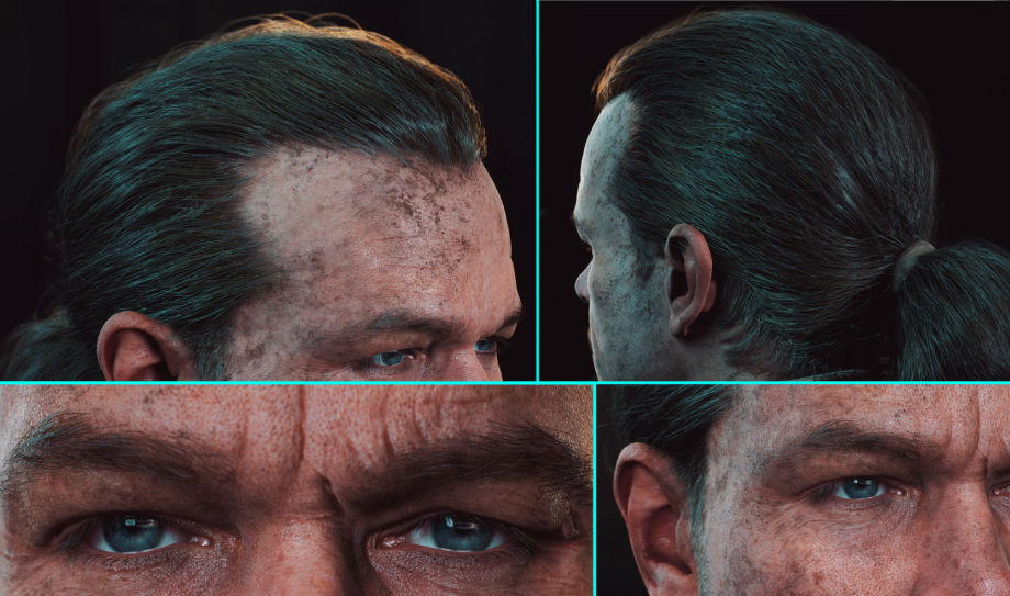 对于马特·达蒙 (Matt Damon) 的肖像造型,首先找到一组具有相似年龄组、相机 FOV 和照明的头部参考图像,用于正面、自下而上的鼻孔、剃光头、四分之三和侧面视图。其次通过测量来雕刻底层的头骨结构和面部标志,例如眼睛,鼻子和嘴唇之间的距离等。使脸部从各个角度都类似于演员,避免直接从图像追踪,因为 ZBrush 中的相机视角和参考图像会有所不同,会影响从各个角度观看时的造型和面部解剖结构。在 Photoshop 中使用快速 ZBrush 屏幕截图进行检查。最后添加细节,如皱纹和毛孔细节。毛孔细节来自头部拓扑/UV 的预制颜色图,将所有烘焙的贴图导出到 Substance Painter 中进行纹理化,对面部纹理细节进行分层,即面部区域色调、雀斑和污垢,从粗糙度、SSS、镜面反射到细节蒙版贴图的所有贴图都会同时调整并放到UE4的自定义皮肤着色器中。第二个可平铺的毛孔细节法线贴图用作微粗糙度分解,使皮肤具有油性。调整Subsurface Scattering 贴图与 Unreal 的 SSS 皮肤配置文件。