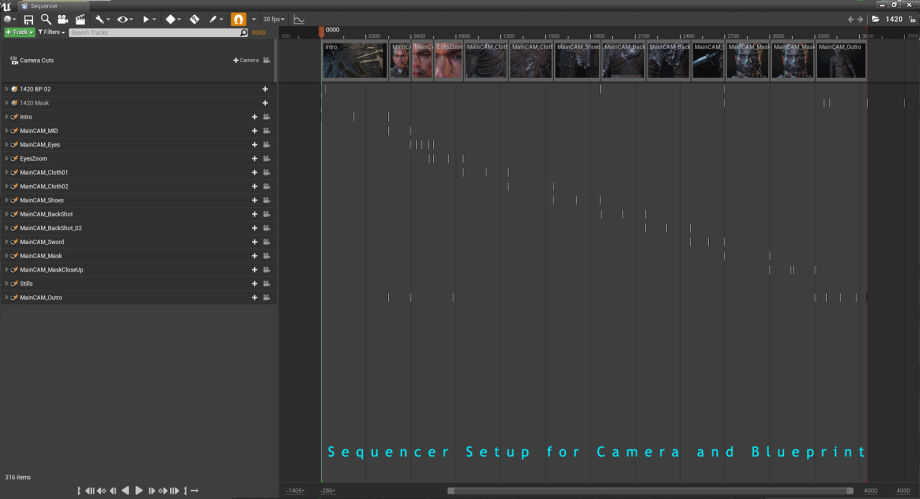模型用四个矩形灯点亮,后处理体积可以通过一些颜色校正来调整 LUT(查找表)。作为渲染后编辑完成,但在UE4中保持简单的步骤,并即时调整值。UE4的 Sequencer 用于创建相机动画和角色蓝图动画设置,希望观众通过讲故事的摄影获得电影体验。Sequencer可以添加和编辑摄像机角度和动作,最终的镜头是通过UE4电影渲染队列渲染的 png 图像序列。