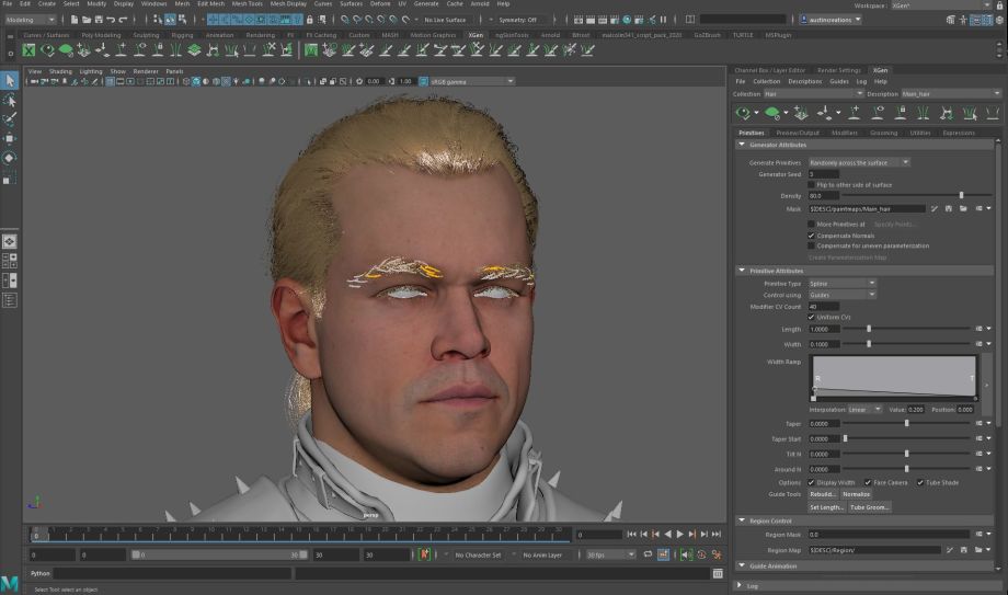 对于头发,使用Alembic Hair Cache的下一代头发技术,将 Maya 的 XGen 用于所有理发,需要遵循某些 XGen 原则。第一步是在头发参考图像上使用 Photoshop 油漆分析发型,方法是将其划分为彩色区域,因为每个区域都指定了流线、风格和发束,有助于头发梳理过程。