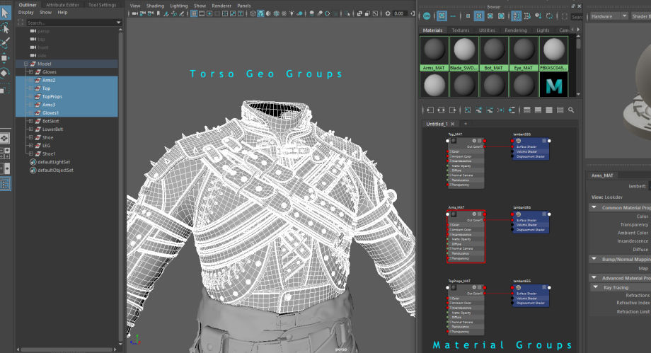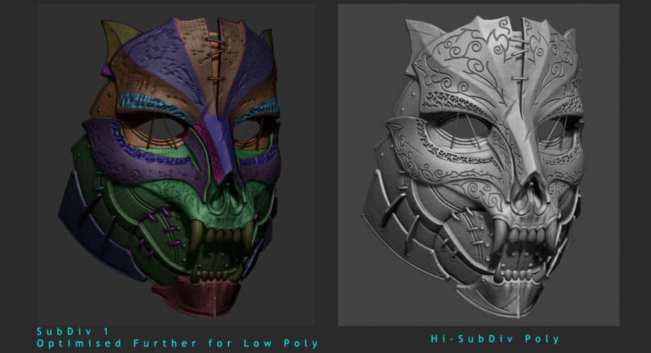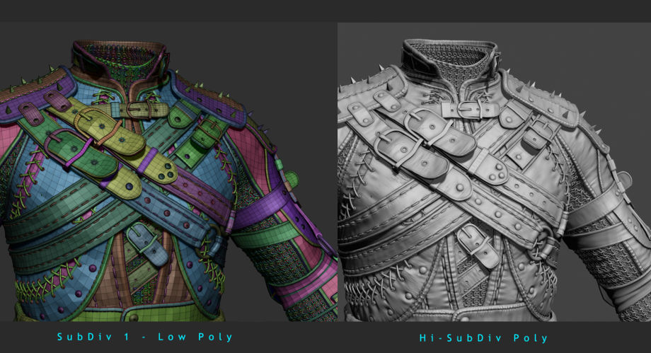 制作中世纪防弹衣和面罩,首先创造一个具有精确解剖比例(7 1/2 头高)的坚固基体。其次在 ZBrush 中以 DynaMesh 草图的形式绘制,改变形式和轮廓,选择了A-pose,让其看起来更自然。完成草图后,使用 DynaMesh/ZRemesh 工作流程清理各个部分,提供一个干净的拓扑结构,并使用 ZModeler 工具增加复杂性,这是对所有元素(如皮带、肩带等)的冲洗和重复过程。对于更大的针迹,创建一个自定义插入网格画笔,并打开曲线模式。细分级别 1 是低多边形,这节省重新拓扑的时间。由于这是游戏中的电影角色,因此对 polycount 有点宽容,但可以进一步优化以满足游戏制作预算。
