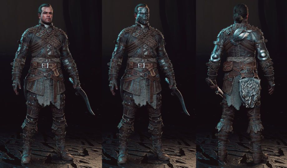 ZBrush主要用于所有建模工作,而Maya广泛用于UV、XGen、绑定、动画,并导出UE4。所有贴图都在 Marmoset Toolbag 中烘焙,而纹理在 Substance Painter 中完成,用于皮肤、织物和金属。许多皮革材质变化是通过结合 Substance Painter 基础纹理实现的,后来将纹理与UE4中的可平铺细节贴图与自定义布料材质相结合。布料具有绒毛边缘功能,可模仿具有微小毛发表面的粗糙织物。主要的挑战是复杂的布料分层,使用 UV 集简化布局。每个 UV 集将占据身体上的一个区域,例如上部躯干被分成 3 个区域。