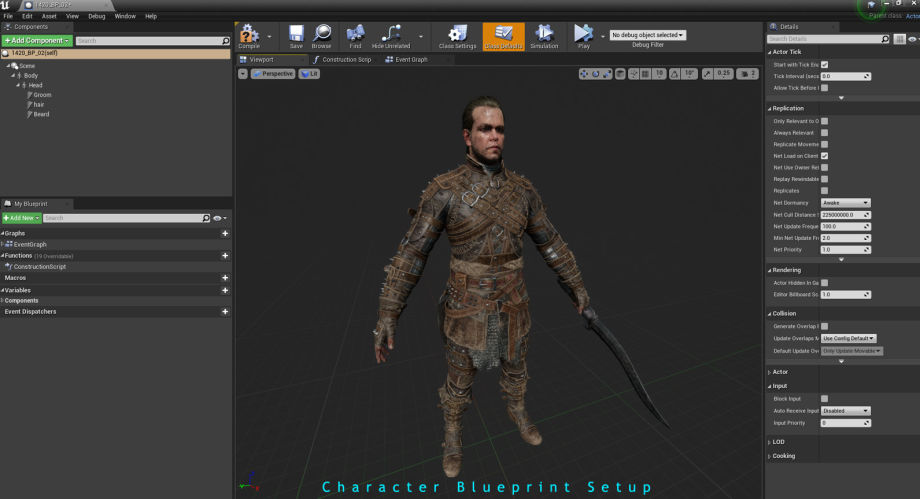 一旦角色的纹理和修饰的静态版本准备就绪,就创建一个自定义的基于关节的面部装备和 IK 驱动的身体装备。将装备/动画 Maya 文件分开保存,这样每个文件都可以独立编辑。动画完成后,将装备和动画导出为单独的 FBX 文件。头部和身体绑定是分开的,因为 Alembic 头发缓存在UE4中有一个联合限制。导入UE4后将头部/身体装备与几何体和 Alembic 头发组装成角色蓝图,同步和混合头部/身体动画后,通过研究无数虚幻文档来实现最终结果。