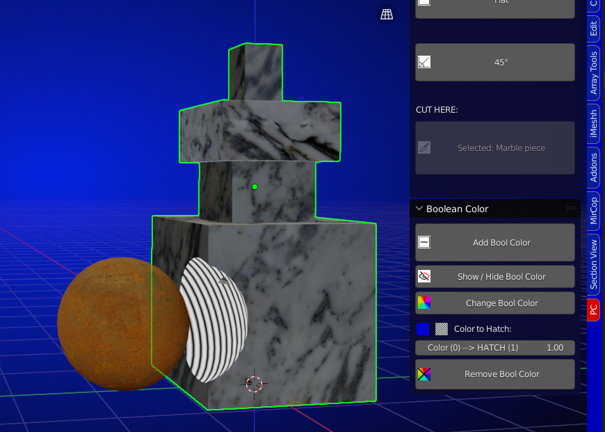 该插件在实体视图中使用,但在材质预览中,您可以选择每个新切割的面都具有可以更改的颜色。