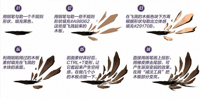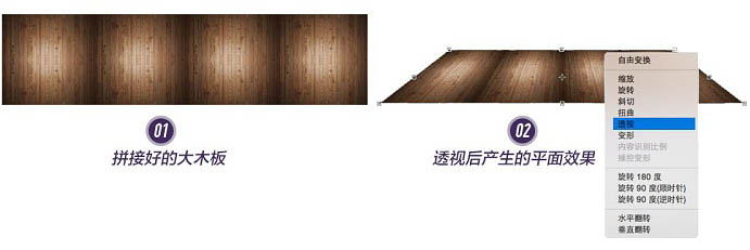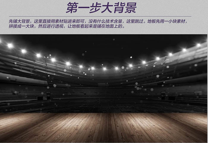 三、制作过程分解: 1、先铺大背景,这里直接用素材贴进来即可,没有什么技术含量,这里跳过。地板先用一小块素材,拼接成一大块,然后进行透视,让底部看起来是铺在地面上的。