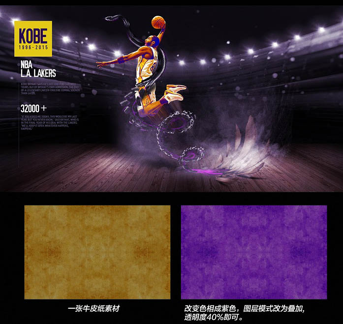 6、找一张牛皮纸素材,改变色相成紫色。混合模式改为“叠加”,不透明度改为:40%,即可。