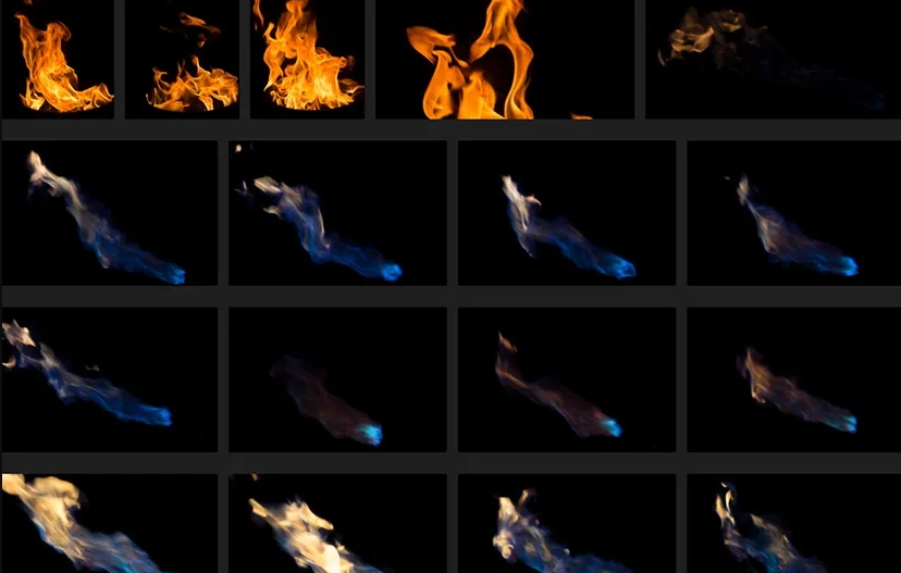 一大堆火和火焰在黑色背景下射出。包括火把、引火物和发光的余烬。每种火焰类型都以不同的快门速度进行系列拍摄,以便提供许多不同的形状可供选择。