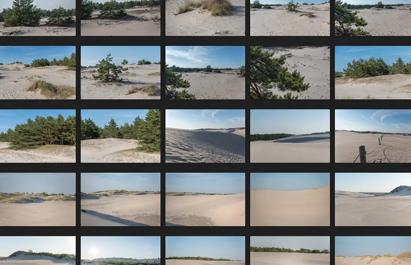 干旱的沿海环境,有浅色沙子和干燥植物。该场景包括荒凉的景观,有沙丘、灌木丛和散落的枯枝。拍摄于 波兰韦巴