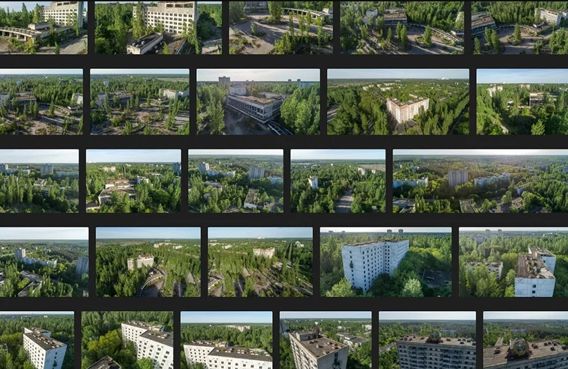 普里皮亚季镇及周边地区的外部参考,该镇因切尔诺贝利灾难造成的放射性而被疏散。镜头涵盖了被森林吞没的空中公寓楼、被忽视的社区地标、杜加雷达、被毁坏的车辆、瓦砾和暗示后世界末日场景的细节。 拍摄于乌克兰普里皮亚季