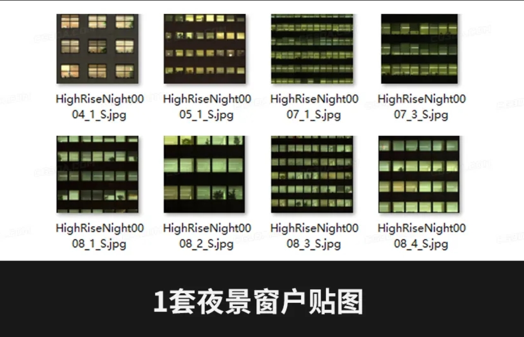 一套夜景贴图夜晚窗户贴图大合集,以上是贴图部分内容,内容过多没有一一展示,全部都是类似的这种城市夜景贴图城市夜晚贴图城市窗户贴图。