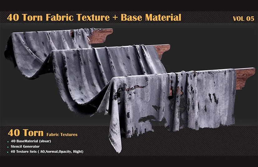 在本产品中,我们为您提供撕裂织物套装,其中包含 40 个高品质的正常、高度、不透明度和环境光遮挡。 40 种基本材质可帮助您在项目中创建更可信的撕裂效果。在此产品中,为了更轻松的工作流程,您可以使用模板生成器访问所有撕裂的不透明贴图。因此,您可以在物质画家中轻松使用这些基础材料和模板生成器。这些材料具有基本参数。通过购买此包,您可以毫不犹豫地在您的材料中使用这些无缝纹理,因为它们的质量使您的进度不会落后。