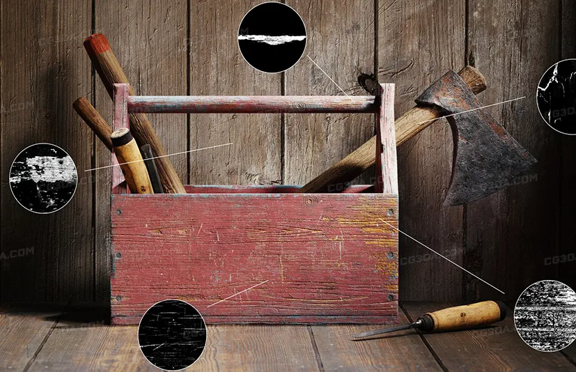 一组 72 种逼真且完全可定制的木材表面瑕疵纹理,可增加渲染中的照片真实感。