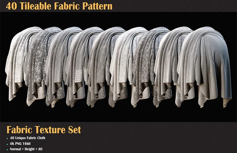 40 个高品质织物纹理集包,其中包含法线、高度和环境光遮挡,可帮助您在项目中创建更可信的织物材质。通过购买此包,您可以毫不犹豫地在您的材料中使用这些无缝纹理,因为它们的质量使您的进度不会落后。