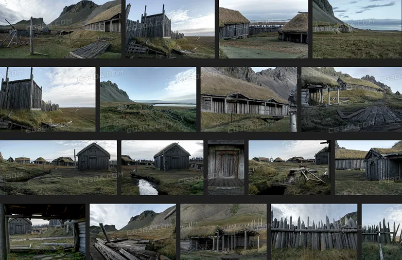 重建的维京古村落遗址,以传统的木制房屋和覆盖着青草的屋顶为特色。建筑结构和细节的引用突出了对这一时期北欧小村庄的真实描绘。