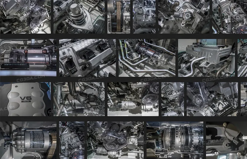 这个小型科技主题套装展示了混合动力汽车发动机中许多复杂的零部件的详细拍摄。这些参考资料可用于各种未来派机器人或科幻设计目的。