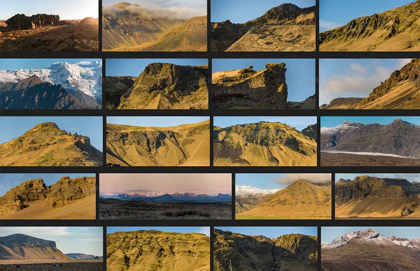 这个套装包含了冰岛广袤景观中的各种山脉。这些山脉的气候各不相同,从雪覆盖到干燥,拍摄的气氛光照条件包括白天、黄金时段、日落和黄昏的许多镜头和高分辨率全景照片。