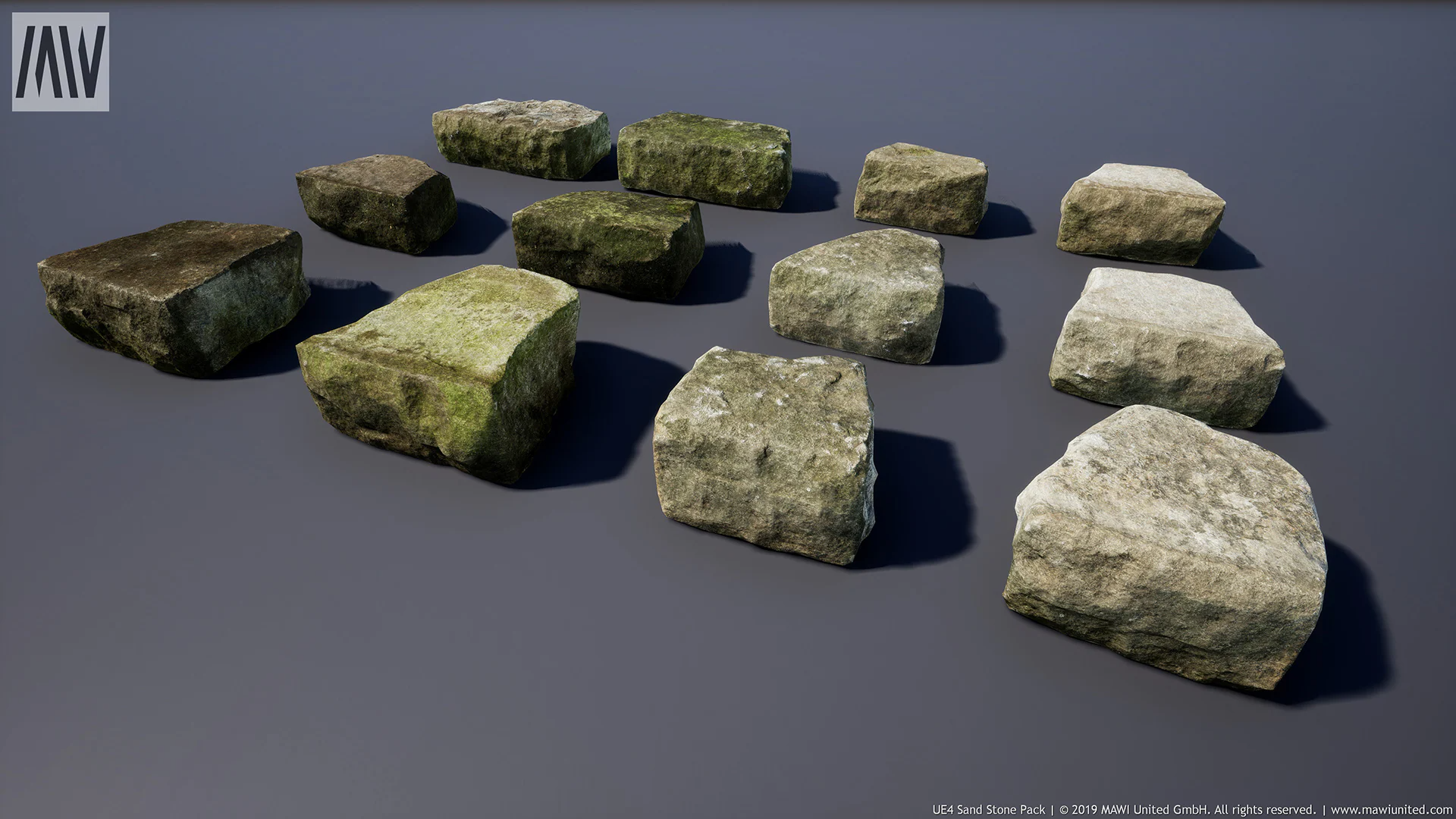 六个高分辨率砂岩模型。每块石头都带有 4k 颜色和法线贴图,这些石头具有独特的顶部和底部,使其用途广泛,可用于不同的组合。它们按照真实世界的比例进行建模,长度在 17 到 28 厘米之间,非常适合 VR 应用程序。
