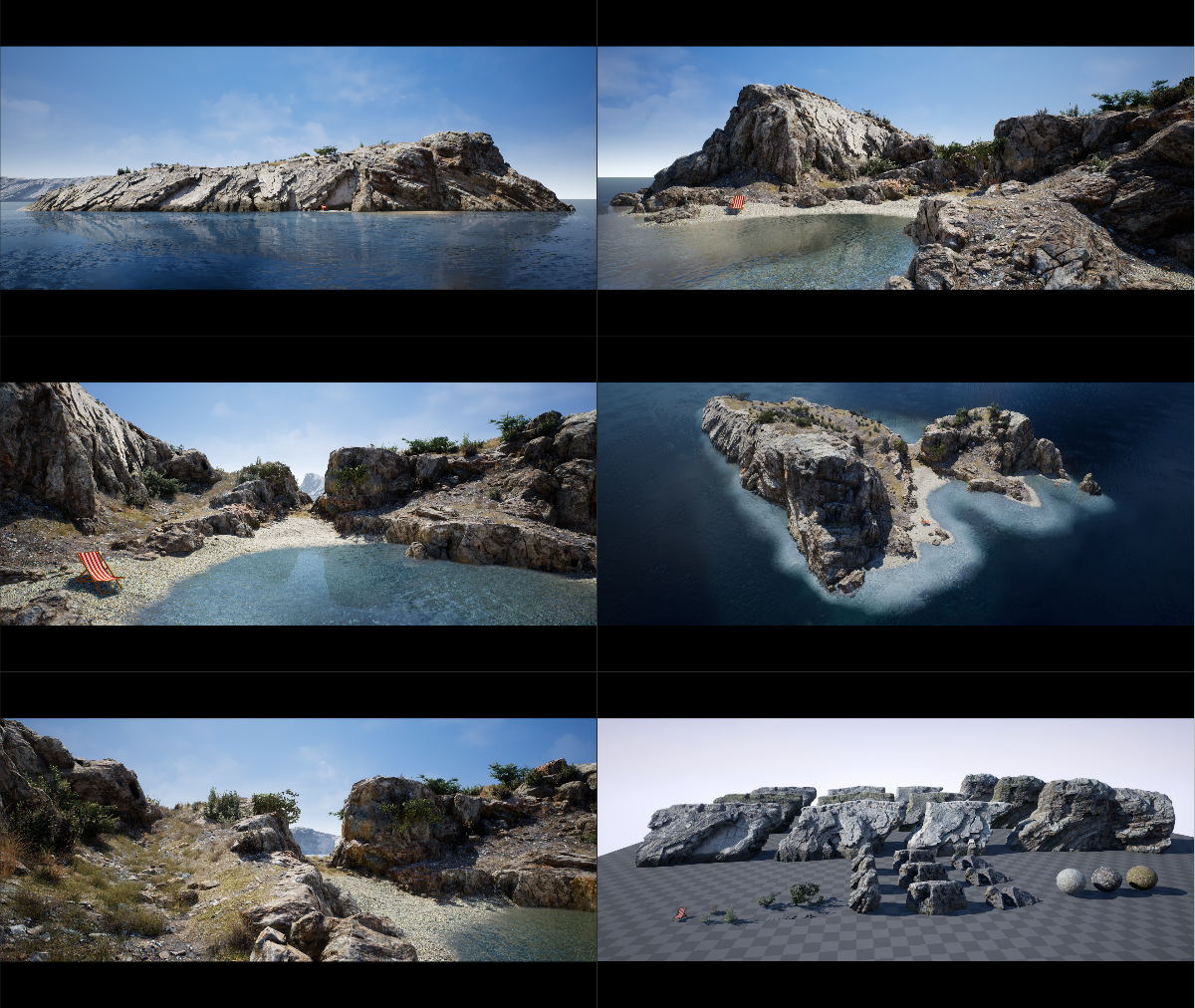 纹理大小:(3)用于大悬崖和岩石的4k纹理集合,(3)用于地面材料的2k纹理集合,(2)用于植被资产的2k和2(2)组512纹理,(3)用于小岩石和太阳椅的1k纹理组,