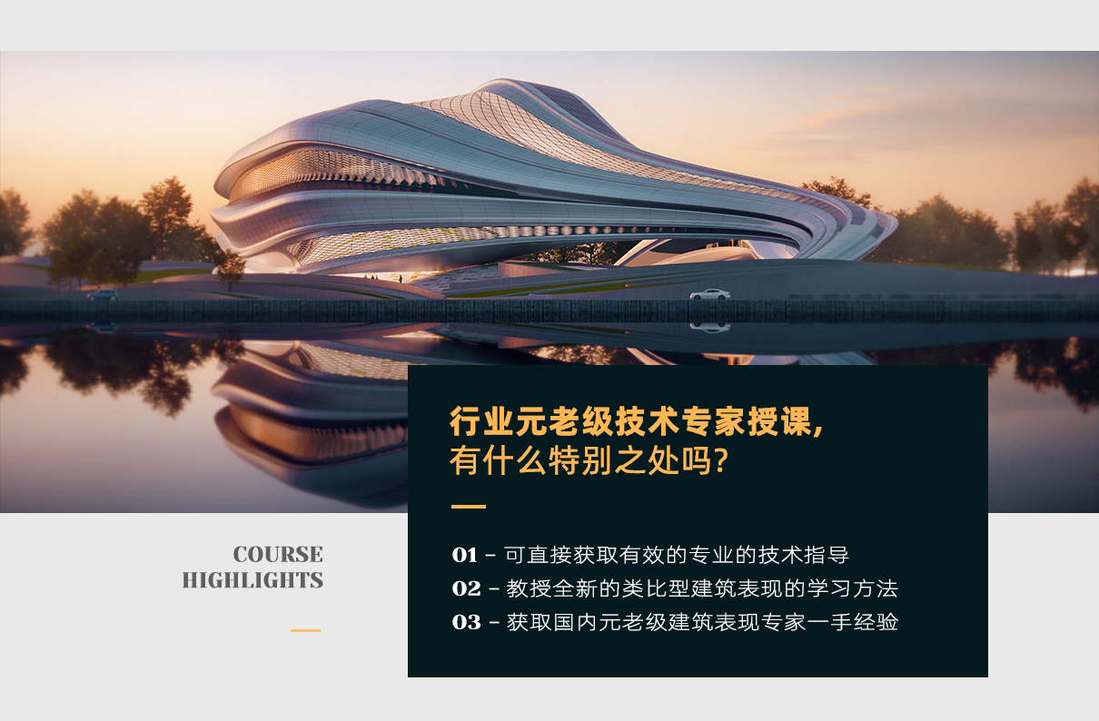 本教程通过讲解建筑表现行业里的关键节点技术加以配合几大案例实战学习,教程会将建筑表现工作中的节点知识诸如透视,相机,材质,灯光,渲染,后期分成诸多知识点来详细讲解,旨在帮助建筑表现学习人员在头脑里建立一套全新的建筑表现学习体系,让大家正确认识建筑渲染,一扫以往脑海里对建筑效果图的浅显认识,学会建筑表现的重点技术,以及建筑学的进阶知识。